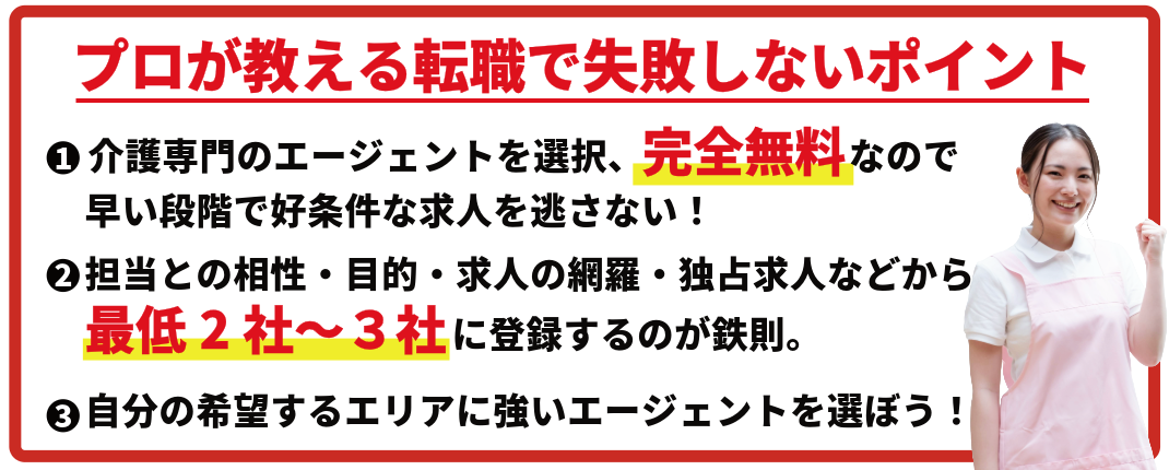 この2社を選んだポイントは、まず①『かいごガーデン』は親会社ツクイが介護サービス35年のエキスパートということもあり、事業所との関係性が非常に深く、保有する非公開求人も特徴的で他にはない求人が見つかる可能性が高いです!ちなみに豆知識ですが、好条件求人は応募が殺到してしまうため、求人を非公開にして有力なエージェント経由のみで一部の方だけにご紹介することで、コストを抑えているのです。続いて、②『レバウェル介護(旧:きらケア)』は事前の職場見学が可能など各事業所からの信頼が厚いエージェントです。その結果として、多くの非公開求人数を保有しており、決定率も非常に高いそうです。また、職場が決まった後のお仕事開始後でも悩みがあれば相談できる窓口を用意しているため、安心して転職ができます!このようにエージェントによって強みは異なってくるため、複数のエージェントを併用してしっかりとエージェントを使い分け、網羅的に転職活動を進めて行きましょう!是非参考にしてみてくださいね!